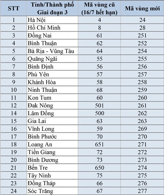 Quý khách hàng có thể theo dõi bảng mã vùng thay đổi như sau: